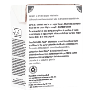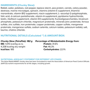 Rabbit-MAINT feline chunky stew contains a limited number of highly digestible ingredients, a nutrient profile that supports gastrointestinal health, and is appropriate for elimination diet trials, with novel protein sources, in cats suspected of having allergic dermatologic or gastrointestinal disease.